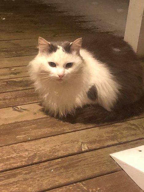 Siden nyttårsaften har hun/han flyttet i vår vinterhage. Uskadd og i tilsynelatende god behold; klumpet pels på mage og bakben. Lar ikke henne/han inn for det ble allerede bråk med våre egne katter, men matt og vann har hun tilgjengelig i hagen. Først satset vi at hun/han ville finne veien hjem selv, men nå etter et par uker virker det at hun begynner å trives her...