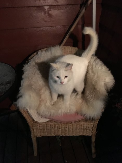 I går kom den inn, sover og spiser godt. Men jeg har gitt den mat hver dag, har alltid mat stående ute til villkattene. Nå er hunden min borte noen dager, da turte katten komme inn. Tydelig at katten er vant til folk.