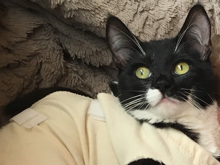 Hun er en sort og hvit, korthåret, liten pus på 2 år. Korte hvite sokker på forbeina, hvite strømper på bakbeina. Noe hvitt i fjeset, hvit hals og hvit buk. Hvite værhår.