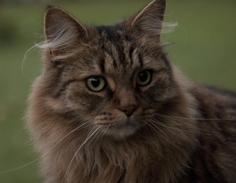 Hospi er en langhåret hankatt (Norsk Skogskatt type) med stor buskete hale. Han har