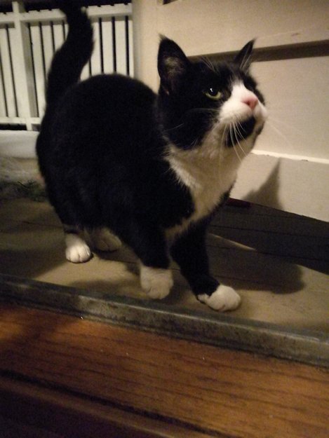 Denne skjønne katten har forsøkt å flytte inn til oss i over én uke. Den ligger ute på verandaen stort sett hele døgnet og løper inn døra så fort den åpnes. Den spiser fuglematen som legges ut så den virker sulten.