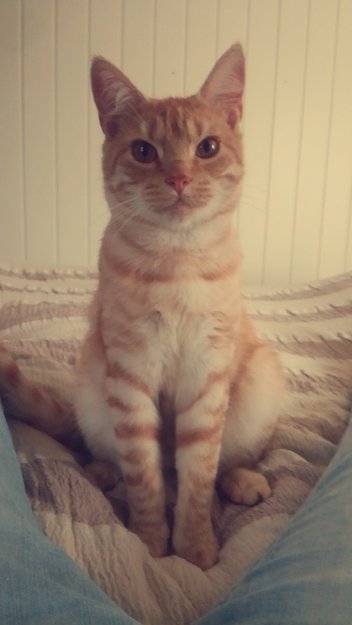 Han har brune øyne oransjbrun pels med noen hvite striper han har middels lang pels og rundt det eine øyet har han et utslett som er lite synligt