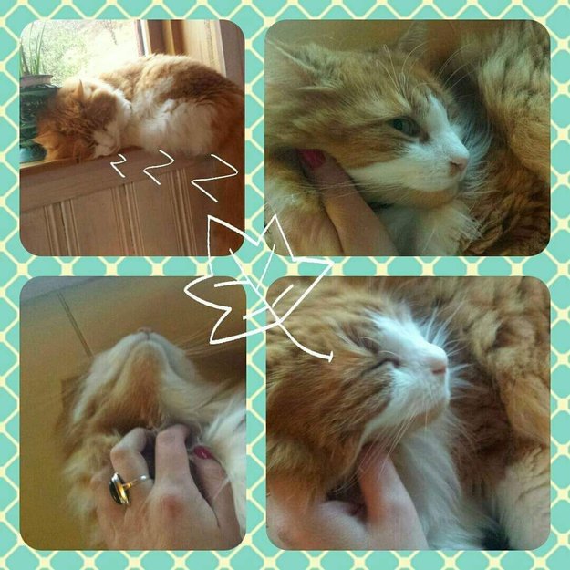 Han er hvit og orange, hvit på brystet, poter, snuten, litt ved munnen og hvit litt krøllet mage. Litt mørkere røde striper på halen som er litt svak og en liten rød flekk ved snuten. Han er semilanghåret. og har noen kortere flekker ved halsen da han nylig var under narkose. Han har en M i pannen.