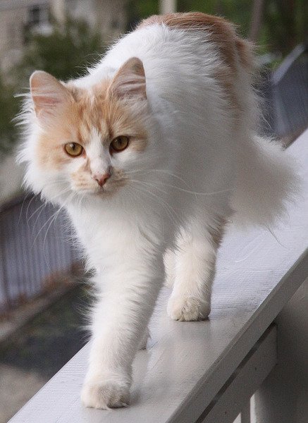 Hvit med lys brune partier, langhåret, stor bustet hale, ID-merket og kastrert.