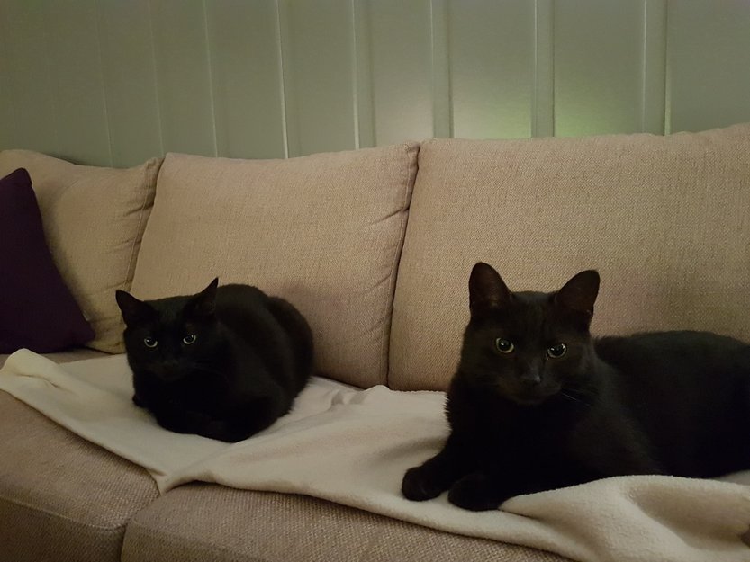 Begge er svarte og ser på avstand helt like ut. De er kastrert og ID-merket. Kattene har alltid vært sky, men hadde funnet trygghet i sitt nye hjem og gikk ut og inn. De var aldri borte lenge av gangen inntil de plutselig forsvant.