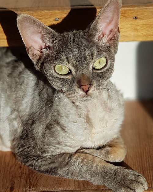 Han er en grå Devon Rex. Han er relativt liten, lite pels og store ører. Han er også chippet.