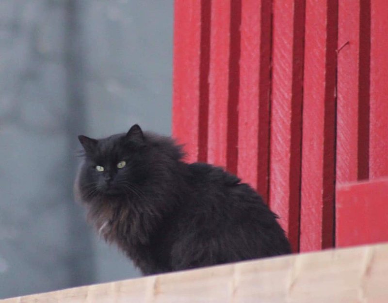 Svart med litt hvitt på brystet.Katten har mye tover så pelsen ser stor ut. Tror det er en jente. Den er kosen og tillitsfull. Den er ikke chippet.