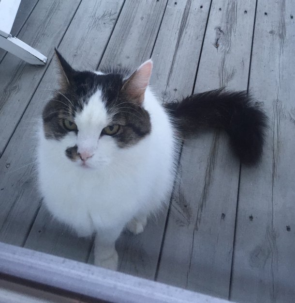 Katten kom utenfor huset vårt 18 februar på kvelden, og nå etter et døgn holder den fortsatt til utenfor hos oss. Den er veldig rolig og kosete og vil veldig gjerne inn. Katten er hvit med mange mørke felter på feks det ene øret, flekk bakpå bakbeinet.