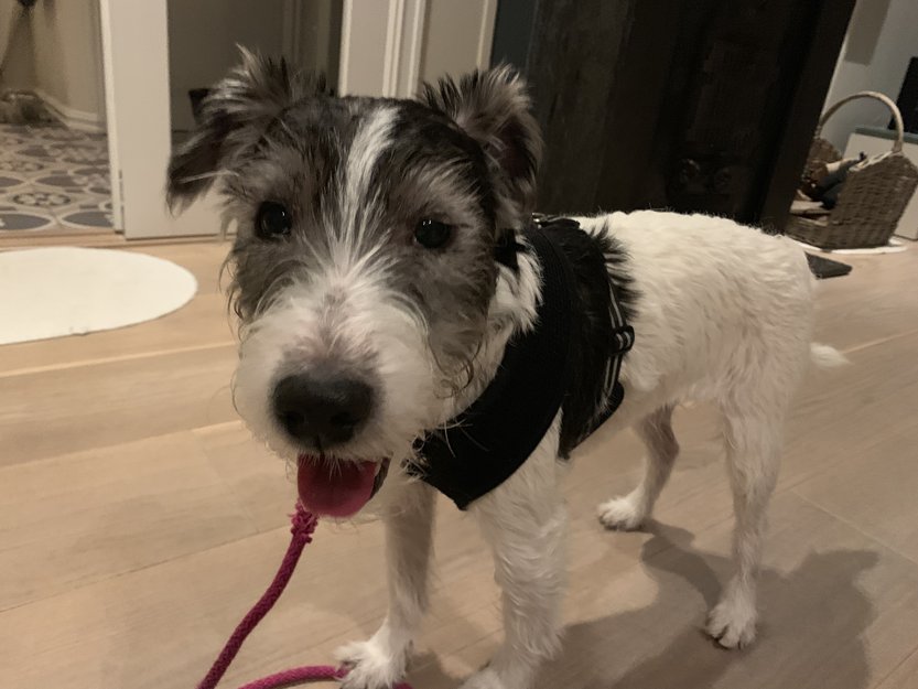Sort og hvit, sort i front. Har på sort sele. Er chippet men finner ikke registrert.