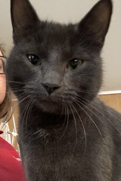 Han er mørk grå med hint av tigerstriper, kort pels og en liten hvit flekk på brystet. Han er chippet og vaksinert, ble 1 år for kort tid siden. Han er leken og nysgjerrig, svært glad i varme og sofaen. Han er matglad, men sprek og i fin form.
