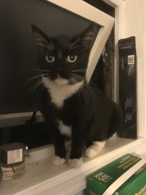 Sort med hvit bryst og hvit poter. Ukastert. Snakker mye.