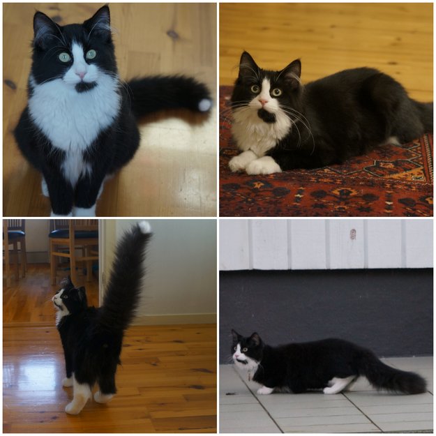 Hun er svart og hvit med lang pels. Halen er svart med en hvit tupp i enden.