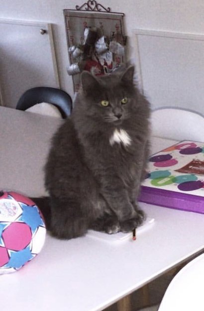 Han har veldig mye pels. Han er grå men har litt hvitt under haken. Ser ut som at han er tjukk, men har egentlig bare veldig mye pels. Jeg vil si det er en kattunge siden vi har ikke hatt han i ett år enda.