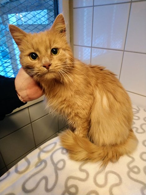Langhåret rødpus. Ukastrert hannkatt. Tillittsfull, tynn og med endel sår så tydelig gått ute en stund.