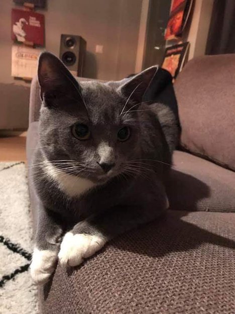 Veier 4,5 kilo. Grå i pelsen med hvit bryst/mage og hvite "sokker".