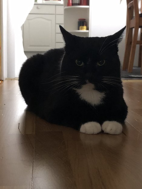 Han har en liten merke midt på panne. Han har ikke øynebrynn i høyre side. Han mjauer veldig mye.