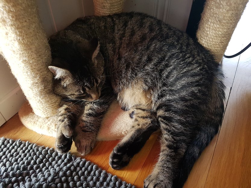 Ekstra tær på alle fire. Blå ID tatovering i venstre øre. Stor katt.