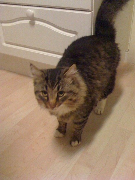Katten er ekstremt kosete, og er en høvelig stor katt. Den har hvite sokker på alle fire bena, og en hvit krage.