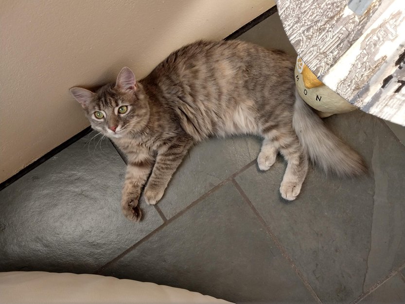 Hun er grå, lys grå, og beige/hvit, også er hun tigerstripet. På brystet har hun en liten lys brun flekk. Hun har lys eyeliner, og grønn og gule øyne. Hun er ca. 3 kg, og er litt over et halvt år.