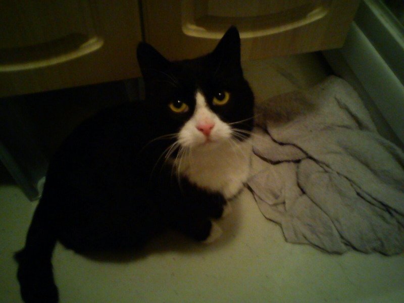 Sort, korthåret katt med hvit snute, hvite sokker og hvitt bryst. Kort hale - amputert eller medfødt?