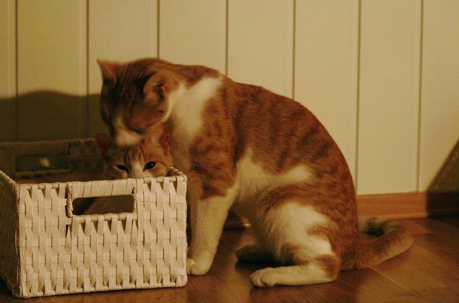 Han er ginger og hvit. Har litt langt ansikt. Litt stor pus.