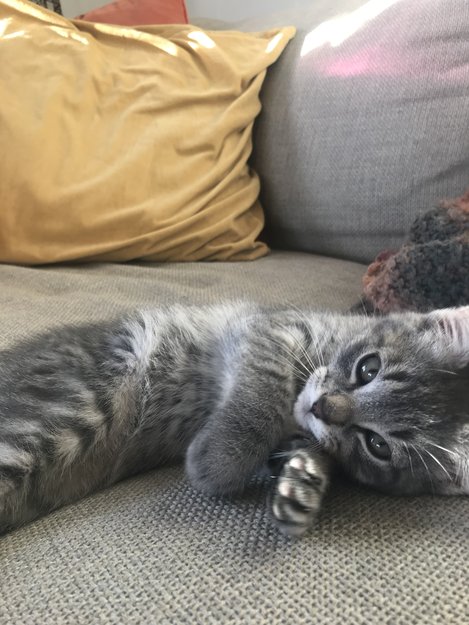Liten, grå katt med lyse striper. Blå/grønne øyne. Lange ører. Utadvendt og glad i mennesker