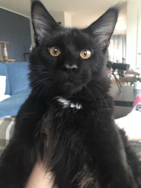 Svart katt med hvit halespiss, hvit nederst på bakbein, hvit flekk på halsen.