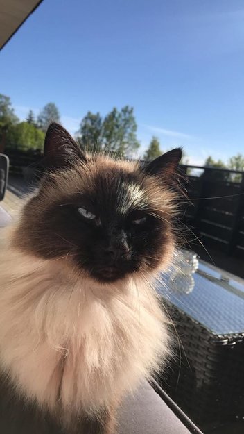 Han er en litt sjernert katt som mjauer en del når den er sulten/redd. Han har svart ansikt med grå/hvit pels. Ca 10 år gammel.