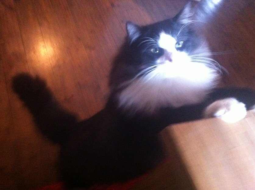 Svart og hvit langhåret, stor hannkatt.