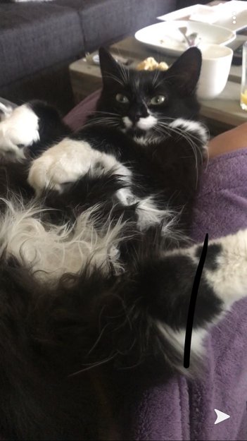 Svart og hvit semi langhåret pels, hun har hvite sokker og mage, samt en liten bart.