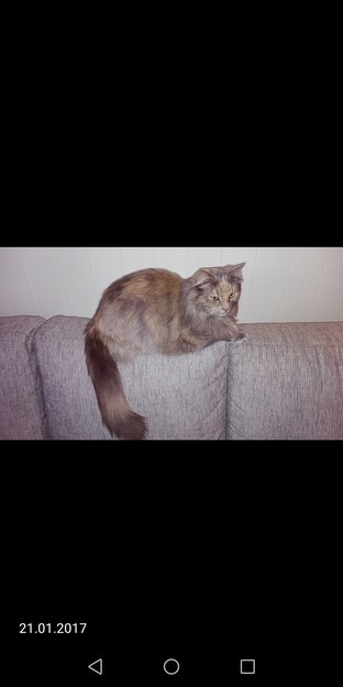 Grå med brune striper på rygg og hale. Har chip og nr i øret. Er veldig sky.