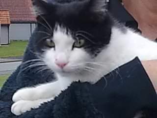 Tillitsfull og menneskevant hannkatt. Hvit med svart på hodet, ryggen og på halen.