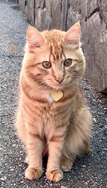 2 år gammel. Lys beige / rødlig halvlang pels med tigerstriper og tykk hale. Litt hvit på brystet og ytterst på den bustete halen. Slank / tynn. Halsbånd med strikk og gullfarget hjerte med navn og tlf. nr.
