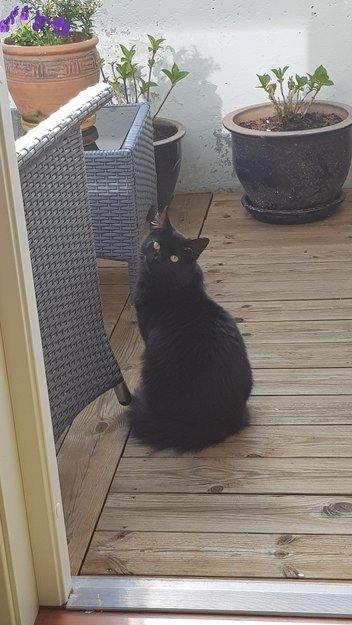 Han er helt svart. Korthåret på kroppen, lang pels på halen. Han har litt villkatt i seg og er derfor veldig forsiktig.