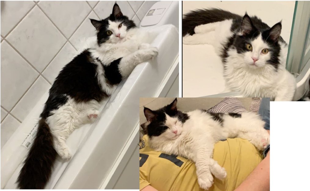 Pompen er halvt skogkatt, 10 måneder gammel, ca 5 kg tung og har langhåret svart og hvit pels. Han er chippet, og hadde på seg et oransje halsbånd med refleks da han gikk hjemmefra.