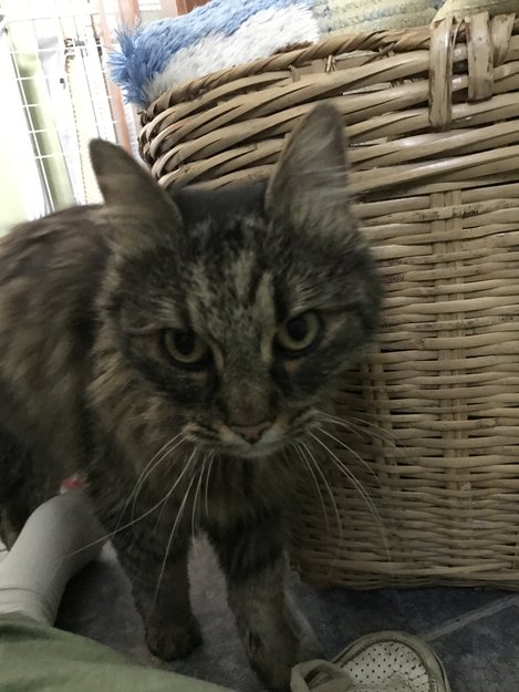 VELDIG VIKTIG Å FÅ HUN HJEM ETTERSOM HUN HAR EPILEPSI. Hun er ganske tynn med spraglete mørk pels og store grønne øyne. Hun er chippet til kattedøren og skal ha rosa halsbånd på seg.