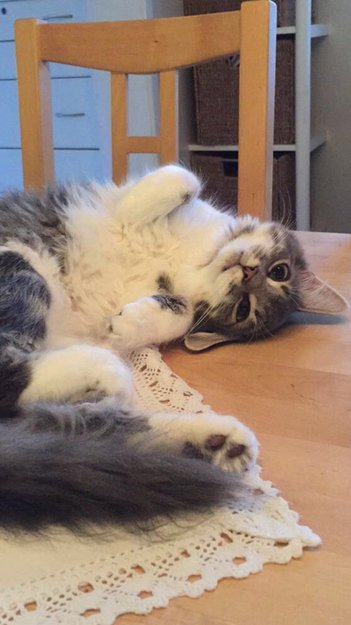 Hvite tegninger rundt øynene, grå prikker på potene, buskete hale, grønne øyne.