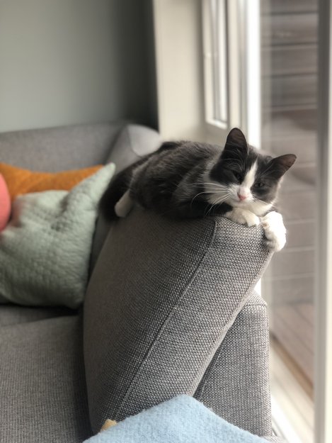 Hvit rundt snuten, og på alle poter. Hvitt bryst og rosa nese. Nylig sterilisert, og har et lite arr på magen.