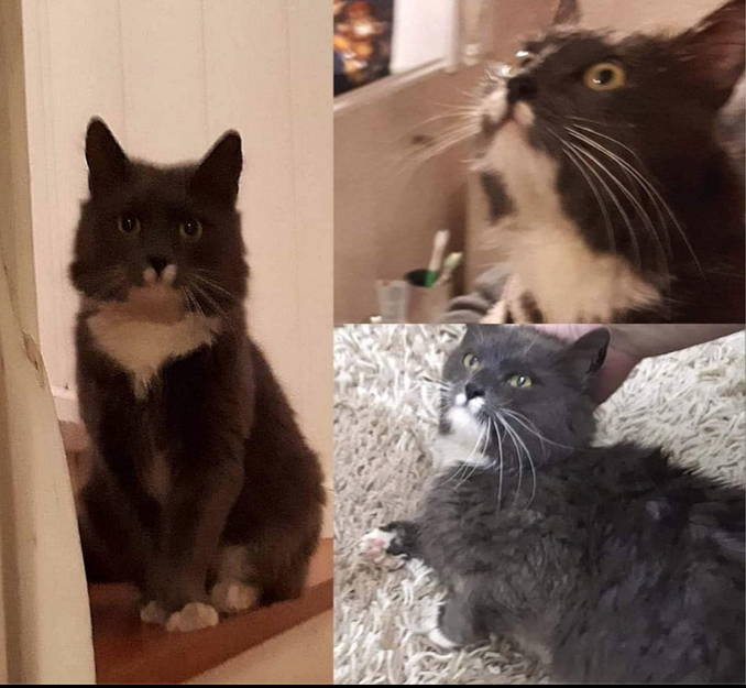 Grå, hvit bart, hvit under hake, bryst og laber.