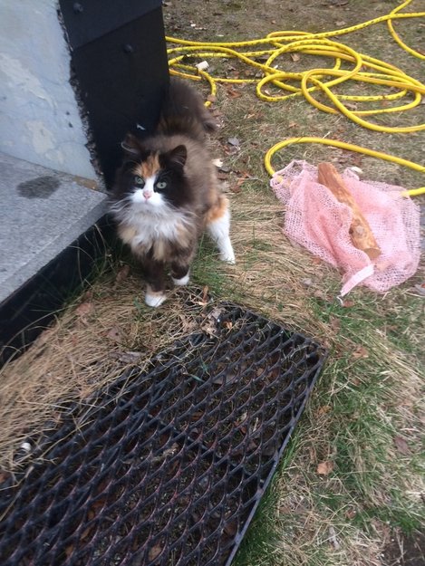 Satt plutselig en dag i et tre ved huset og har oppholdt seg der siden. Litt skeptisk, men leken. Hun var litt tynn når hun først kom og pelsen er veldig flokete.
