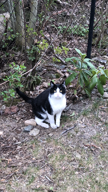 Svart og hvit katt oppholder seg i området rundt huset. Kjælen og kontaktsøkende, men litt skeptisk til høye lyder og plutselige bevegelser. Veldig sulten, så blir matet jevnlig. Usikker på kjønn og har ikke sjekket for chip enda.