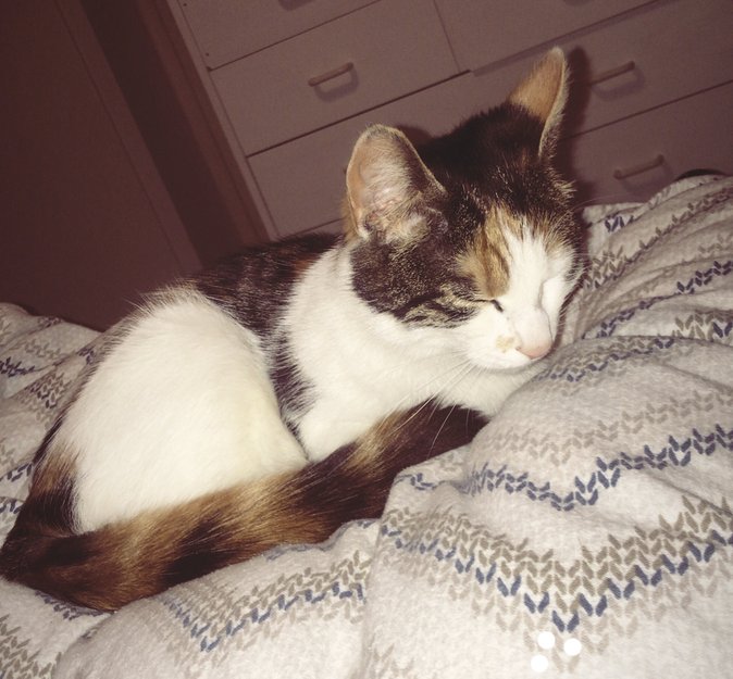 Hun er mest hvit i pelsen men har også oransje, svarte og grå flekker.