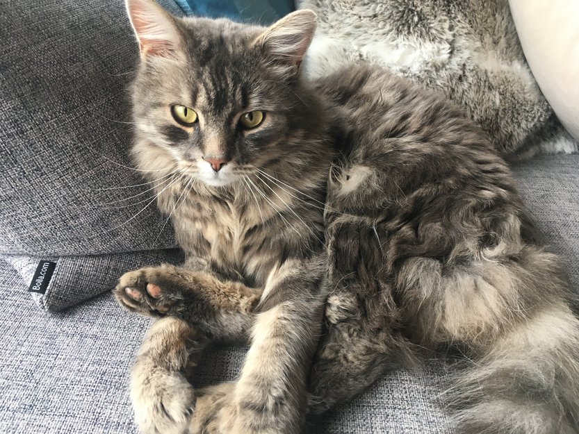Katten har vært svært kontaktsøkende fra rundt påsketider. Bærer preg av manglende stell. Oppholder seg mye på vår terrasse og uteområde.