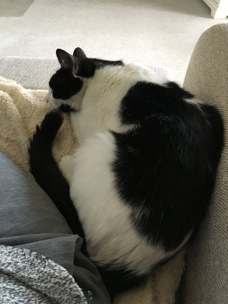 Sort og hvit hunnkatt. Hun er ikke glad i fremmede, og kan virke litt redd.