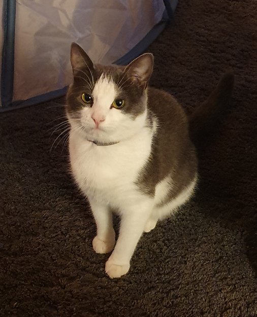 Grå/Hvit hunnkatt med rødt halsbånd med refleks og navn og nummer på.
