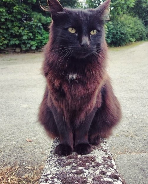Rambo er en kastrert, langhåret, svart/delvis mørkebrun, katt med litt hvitt på brystet og nedre del av mage. Er en rolig og kosette katt.
