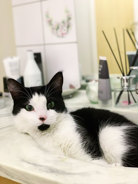 Han har en svart flekk under nesen på "på haken" . Svart og hvit. Grønne øyne. Normal vekt. Veldig fin i pelsen. Kort håret.