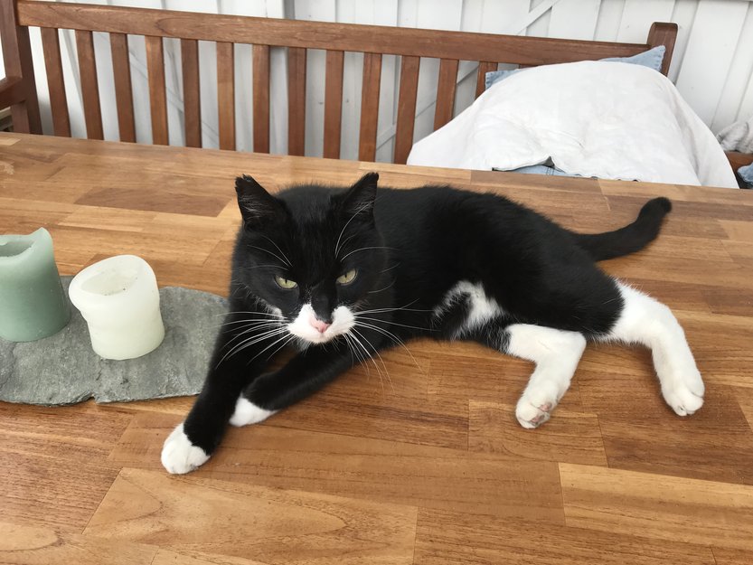 De siste dagene har ei ung svart og hvit katt slått seg ned i hagen vår på Hoff. Den er veldig selskapssyk og kjælen og vil nok gjerne hjem til eierne sine.