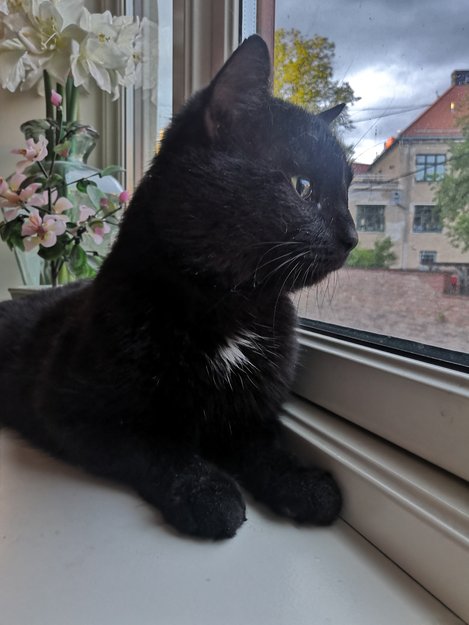 Sort med hvit flekk på brystet og noen få hvite hår nederst på magen. Ukastrert.