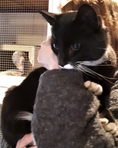 Middels stor hannkatt med ganske mørk brune øyne, finner ingen chip, men er kastrert.